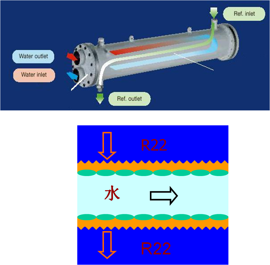 1.  殼管式熱交換器采用高效的雙螺紋銅管,提高了殼側(cè)制冷劑以及管側(cè)冷卻水間的熱交換效果,比普通傳熱銅管換熱效率提高達(dá)30%左右。